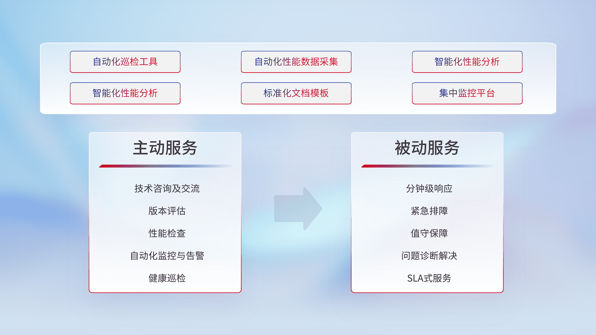 智能化工具和标准化文档,,保障服务质量,,,提供主动服务(包含技术咨询、、、、版本评估、、性能检查、、自动化监控与告警、、、健康巡检)和被动服务包含(分钟级响应、、、、紧急排障、、、、值守保障、、、问题诊断解决、、、、SLA服务)。。。。